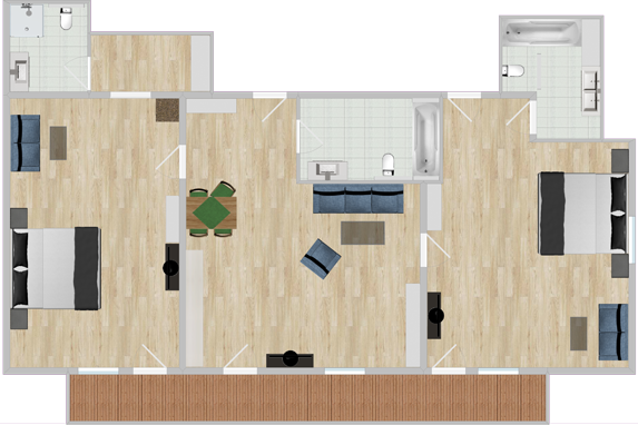 Dieses Appartement verfügt über zwei Doppelschlafzimmer (jeweils mit Ausziehcouch und TV) und einen Wohnraum mit Doppel-Ausziehcouch (ebenfalls mit TV). Der Südbalkon ist sowohl über die Doppelschlafzimmer als auch über den Wohnraum zugänglich. Die Doppelausziehcouch im Wohnraum und im Doppelschlafzimmer kann für eine oder für zwei Personen aufgebettet (auf Anfrage) werden.