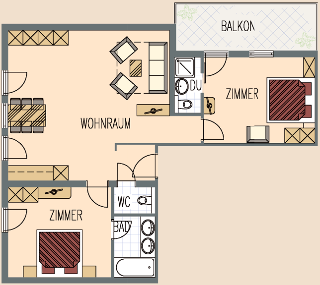 Appartement Rubin, für max. 6 Personen, Raumgröße ca. 64 m², Nordbalkon, Bad/Dusche/WC, Dusche, WC, Doppelschlafzimmer, kleines Wohnzimmer, Wohnzimmer mit Doppel-Ausziehcouch, Küchenblock, Sitzecke.
