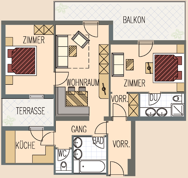 Dieses Appartement verfügt über zwei Doppelschlafzimmer und zwei Badezimmer. Ein Badezimmer ist mit Dusche/WC iund direkt von einem der Doppelschlafzimmer mit Balkon und TV erreichbar. Das zweite Badezimmer ist über den Gang/Vorraum zu erreichen und mit Badewanne/Doppelwaschbecken ausgestattet. In diesem Gang befindet sich ein Extra-WC.