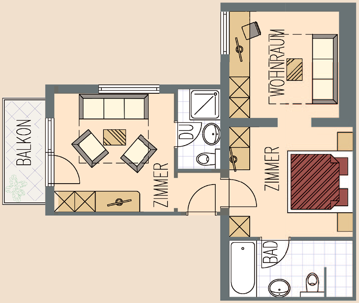 Appartement Rubin, für max. 6 Personen, Raumgröße ca. 64 m², Nordbalkon, Bad/Dusche/WC, Dusche, WC, Doppelschlafzimmer, kleines Wohnzimmer, Wohnzimmer mit Doppel-Ausziehcouch, Küchenblock, Sitzecke.